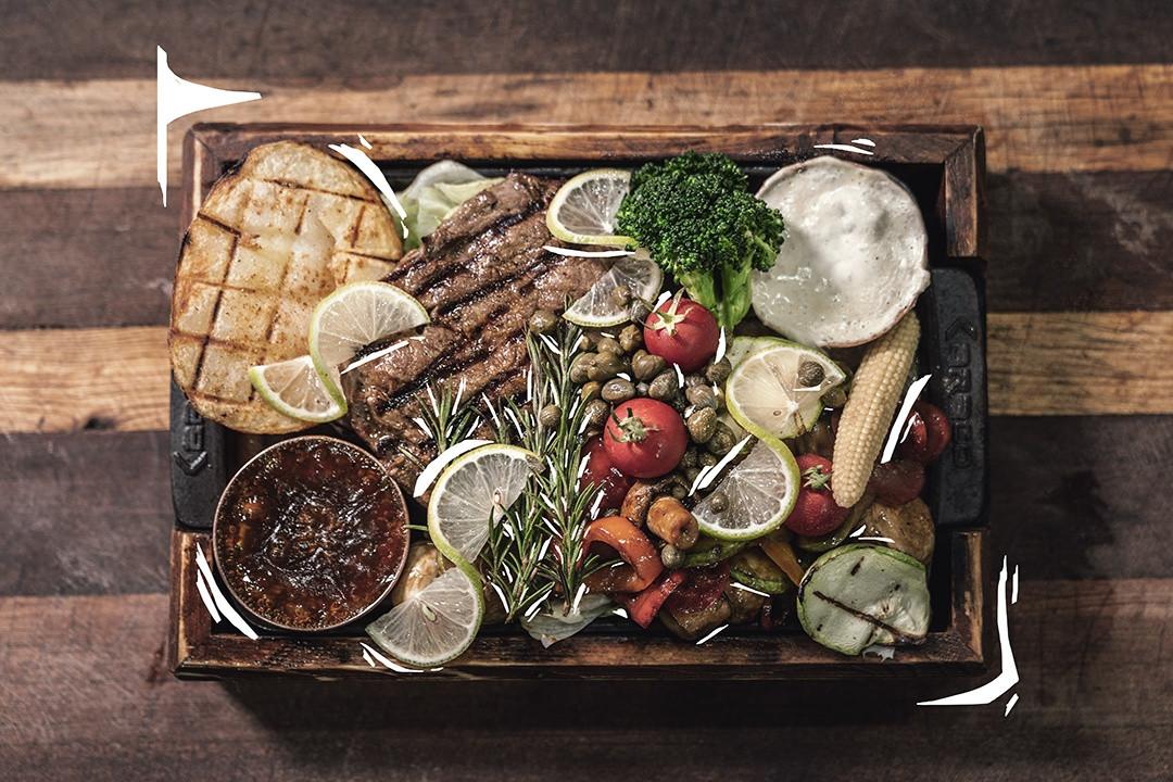 250 گرم فیله گوساله، پوره سیب زمینی، سبزیجات رست شده، سس قارچ، سس تایچیلی