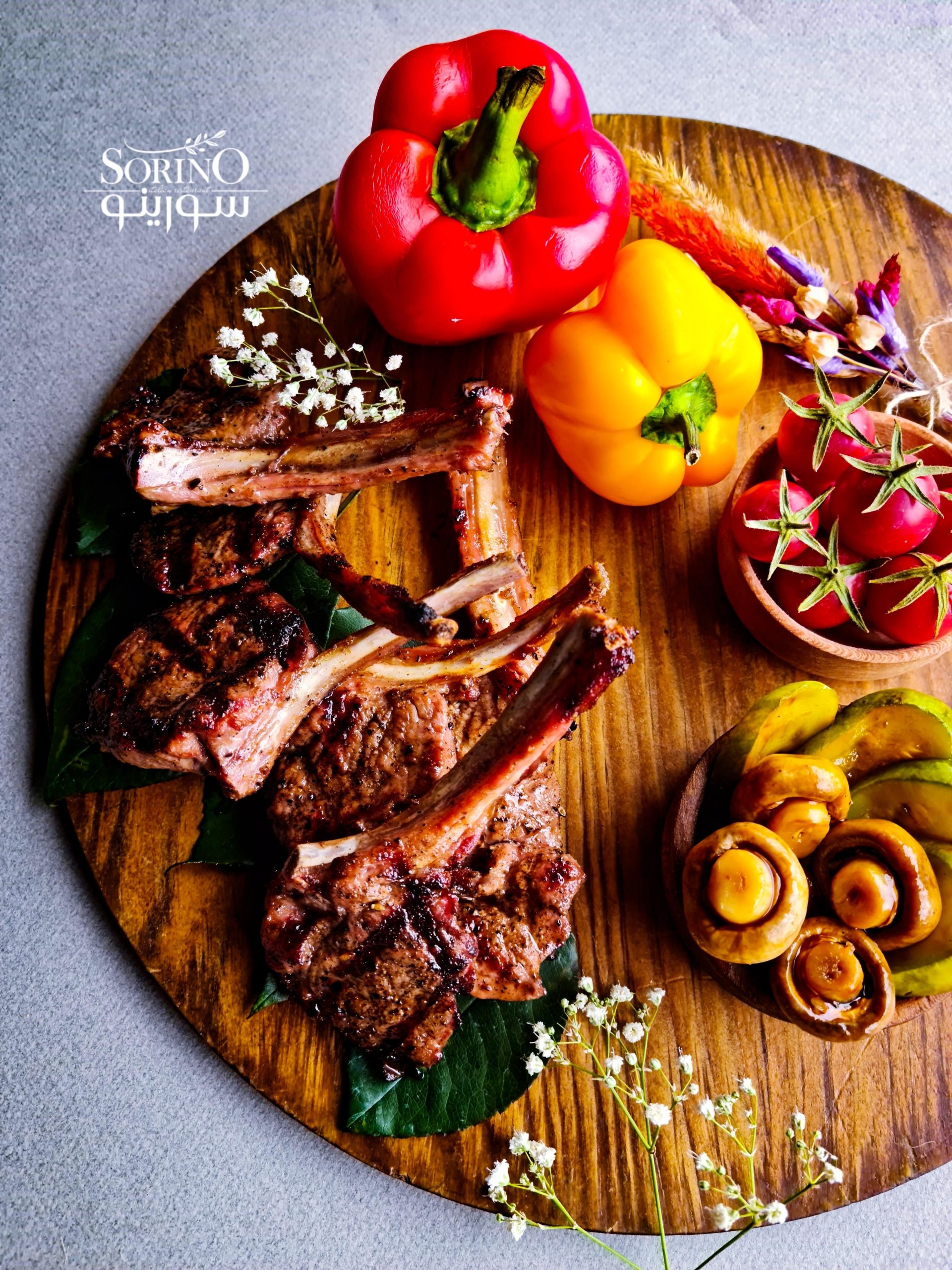 450 گرم دنده گوسفندی، سیبزمینی تنوری، سبزیجات رست شده، سس قارچ، سس تایچیلی